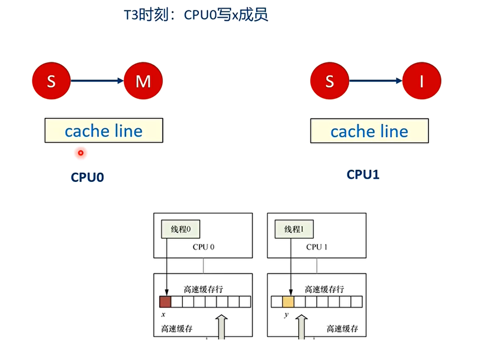 - 举个例子:假设CPU0上的线程0想访问和更新struct data数据结构中的x成员,同理CPU1上的线程1想访问和更新struct data数据结构中的y成员,其中x和y成员都被缓存到同一个缓存行里。